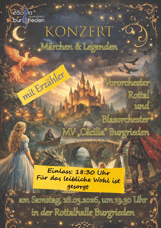 Danach übernimmt das Blasorchester des Musikvereins "Cäcilia" Burgrieden unter der Leitung von Thomas Fritsch das Konzertprogramm. Unser Erzähler und Ehrenvorstand Gerhard Kopp wird Sie durch den Abend führen. Lassen Sie sich musikalisch entführen in Geschichten wie Pinocchio, Harry Potter oder Dornröschen.